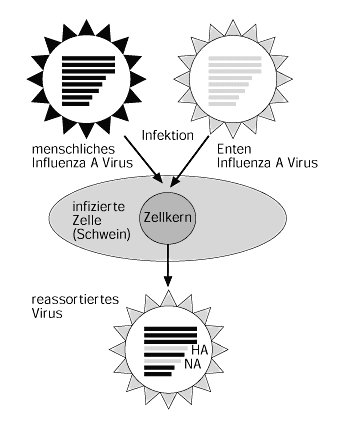 Mit Ausnahme von Schweine-Influenzaviren können Menschen jedoch nur in Ausnahmefällen von Influenza-A-Viren anderer Tierarten infiziert werden. Bei gleichzeitiger Infektion eines Tieres mit zwei verschiedenen Influenza-A-Virus-Stämmen kann es daher zum Austausch von Segmenten kommen. Auf diese Weise kann ein neues Virus mit neuen immunogenen und pathogenen Eigenschaften entstehen (Abb. 2).