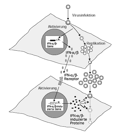 Wird eine Zelle von einem Virus befallen, so reagiert diese mit der Produktion und Sekretion von Interferon-alpha/beta. Die sekretierten Interferone binden an spezifische Oberflächenrezeptoren benachbarter Zellen und lösen so intrazelluläre Signalübertragungswege aus, was die Aktivierung von 50 bis 100 Genen zur Folge hat. Die Interferon-a/b induzierten Gene kodieren für Effektorproteine, deren Funktion es ist, die Vermehrung der Viren in infizierten Zellen zu hemmen. Die Aktivitäten dieser Proteine bewirken, dass die Zelle in einen sogenannten antiviralen Zustand übergehen (Abb. 3). Die Zelle ist in diesem Zustand im Allgemeinen sehr effizient gegen Viren geschützt. Die Viren können zwar meistens noch in die Zelle eindringen, deren Vermehrung im Inneren der Zelle ist jedoch durch die Funktion der interferoninduzierten Proteine stark beeinträchtigt.
