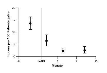1 Häufigkeit (Inzidenz) neuer Aids-Erkrankungen vor und nach der Einleitung einer hochaktiven antiretroviralen Therapie (HAART) in den Jahren 1996 bis 1998. Die Resultate basieren auf 2333 PatientInnen der Schweizerischen HIV-Kohortenstudie. |