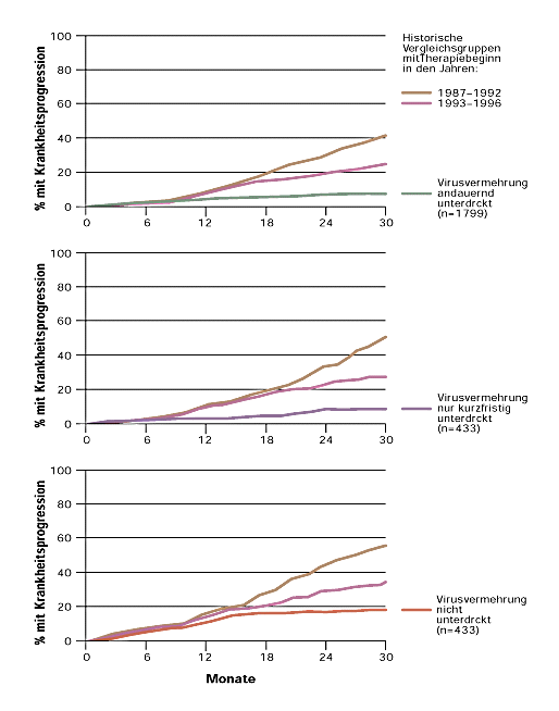 dass unter einer Dreier-Kombination nach vorübergehender vollständiger Unterdrückung der Virusvermehrung im Verlaufe der Beobachtung die Virustiter im Blut wieder anstiegen (virologisches Therapieversagen). Vergleich von vorbehandelten Personen mit solchen, die zu Beginn der Dreier-Kombination noch nie eine Therapie hatten. Unten: Wahrscheinlichkeit, dass nach vorübergehendem viralem Therapieversagen mit einer geänderten Dreier-Kombination erneut eine vollständige Blockierung der Virusvermehrung erreicht werden konnte. |