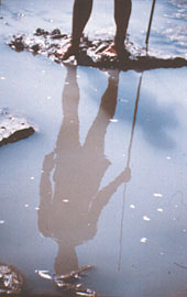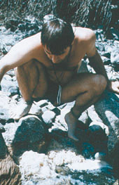 Biefer/Zgraggens Forschungsstudie «Der Beuteträger» (von der hier wenige Bildfolgen abgebildet sind) ist ein Beispiel dafür. In der Photogeschichte inszenieren sie das Leben und Überleben eines Naturvolkes. Dabei schlüpfen sie selber in die Rolle von Wilden. Als Betrachter folgen wir den Bildern in scheinbar ferne aussereuropäische Kultur-Territorien. Wir nehmen teil an einem Kolonisationsprozess. Die beiden Wilden bewegen sich zunächst in freier Wildbahn noch als unschuldige Beuteträger. Doch plötzlich bricht etwas Neues ein, neue, einstudierte Verhaltensweisen treten auf. Bald schlägt die Natur durch Trockenheit und verschmutztes Wasser zurück, in dem sich das Spiegelbild der Akteure spiegelt.